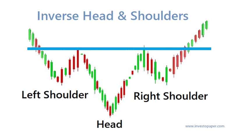 The head and shoulders pattern formed in the opposite direction during the bearish trend is called the inverse head and shoulders pattern. The inverse head and shoulders pattern signals the market reversal of the bearish trend.
