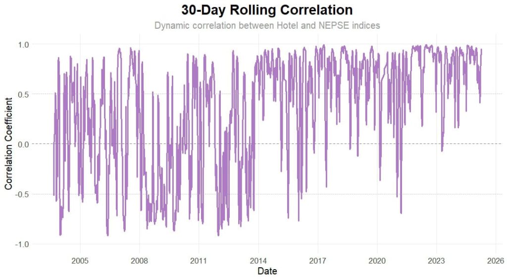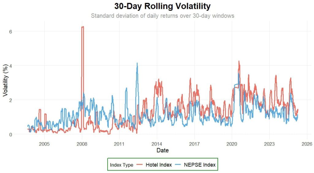 Volatility, measured as the standard deviation of daily returns over 30-day rolling windows, is higher for the Hotel Index (1.6053%) than the NEPSE Index (1.2722%). The rolling volatility plot (Figure 5) shows periods of divergence, with the Hotel Index often experiencing sharper volatility spikes, reflecting the sector’s sensitivity to economic and tourism-related factors.