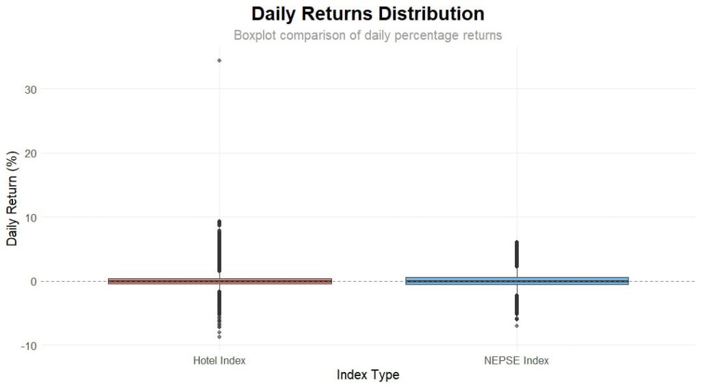 Daily returns were calculated as percentage changes in index values. The boxplot of daily returns (Figure 4) shows that the Hotel Index has a wider range of returns, with a minimum of -8.69% and a maximum of 34.35%, compared to the NEPSE Index’s -6.97% to 6.06%. The median daily return for the Hotel Index is 0%, while the NEPSE Index has a slightly negative median (-0.0069%). The mean daily returns are 0.0823% for the Hotel Index and 0.0594% for the NEPSE Index, indicating slightly higher average returns for hotel stocks.